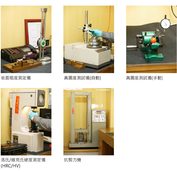 *表面粗度測定儀*洛氏/維克氏硬度測定儀(HRC/HV)*真直度測定儀*真圓度測試儀*同心度測定儀*投影儀*游標卡尺、分厘卡*抗剪力機*拉力強力測定儀